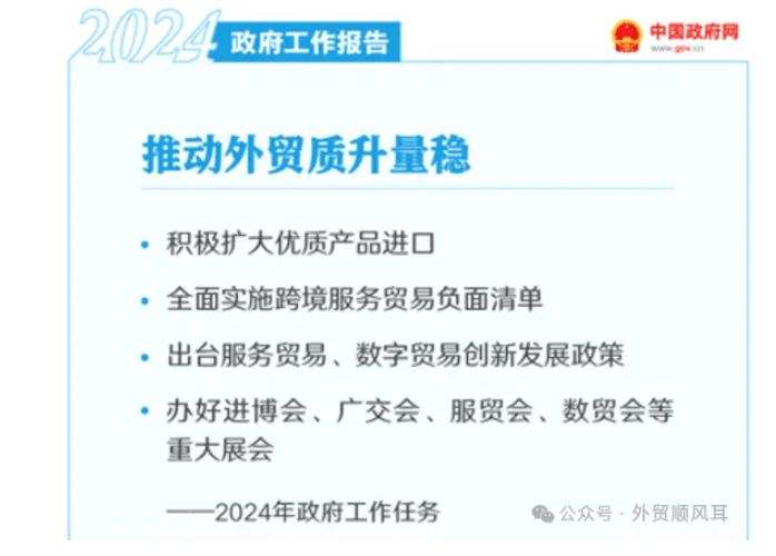 2024年《政府工作报告》中,国家对于国际贸易这块专门提出: